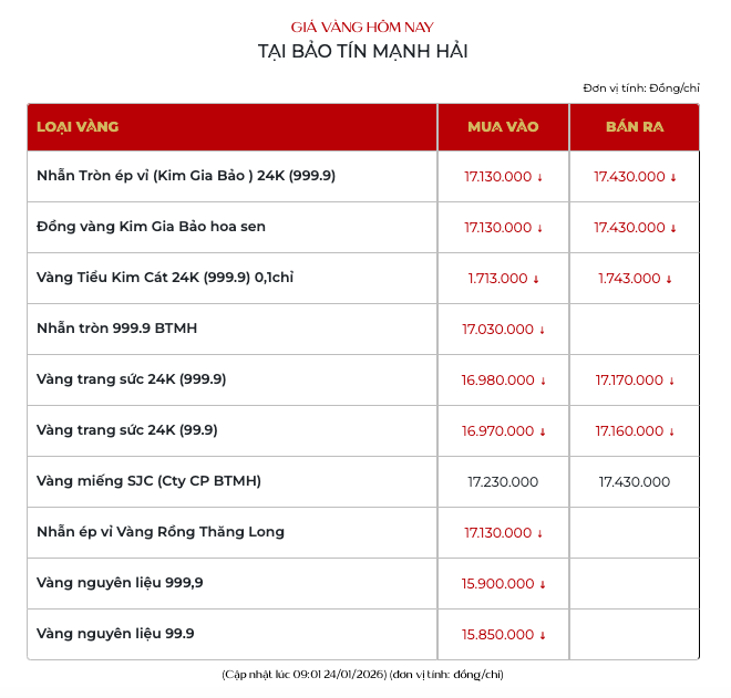 Vàng kim gia bảo của Bảo tín Mạnh Hải niêm yết giao dịch tại 172,3 - 174,3 triệu đồng/lượng.