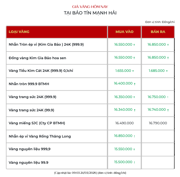 Cùng lúc đó, giá vàng miếng SJC tại Bảo tín Mạnh Hải niêm yết giao dịch tại 164,9 - 167,9 triệu đồng/lượng.