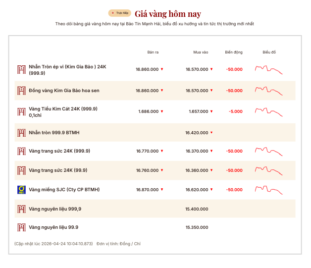 Tại Tập đoàn SJC, Doji, giá vàng nhẫn được điều chỉnh giảm 500.000 đồng/lượng mỗi chiều, xuống còn 165,7 - 168,7 triệu đồng/lượng. Vàng nhẫn Kim Gia Bảo tại Bảo tín Mạnh Hải niêm yết tại 165,7 - 168,6 triệu đồng/lượng.