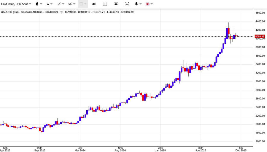 Giá vàng giao ngay tăng 0,28% lên 4.076 USD/ounce, theo Kitco, trong khi giá vàng giao tháng 12 giảm 0,19% xuống 4.108 USD.