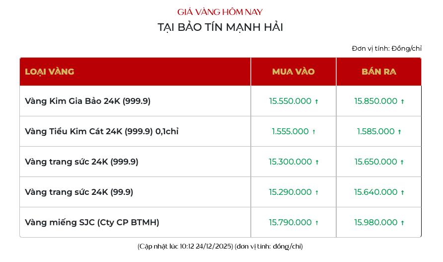 Cùng lúc đó, giá vàng trang sức 24K tại Bảo tín Mạnh Hải niêm yết giao dịch tại 153 - 156,5 triệu đồng/lượng.