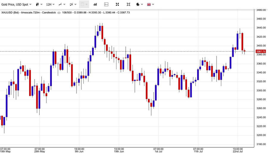 Tuy nhiên, có thời điểm, giá kim loại quý lại điều chỉnh giảm nhẹ về mốc 3.385 USD/ounce, khi xuất hiện thông tin Mỹ và Liên minh châu Âu (EU) đang tiến gần đến một thoả thuận thuế quan 15%, làm suy yếu nhu cầu trú ẩn an toàn.