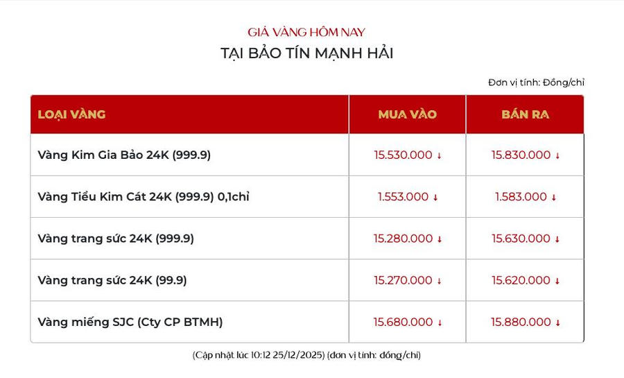 Cùng lúc đó, giá vàng trang sức 24K tại Bảo tín Mạnh Hải giảm nhẹ, niêm yết giao dịch tại 152,8 - 156,3 triệu đồng/lượng.