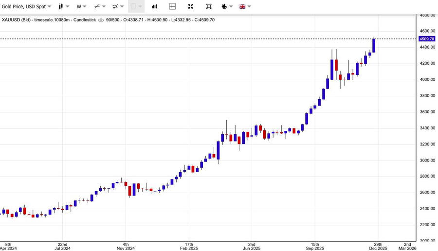 Giá vàng thế giới không có biến động trong phiên giao dịch ngày 25/12, neo trên ngưỡng 4.500 USD/ounce, khi các thị trường chính đóng cửa nghỉ lễ Giáng sinh.