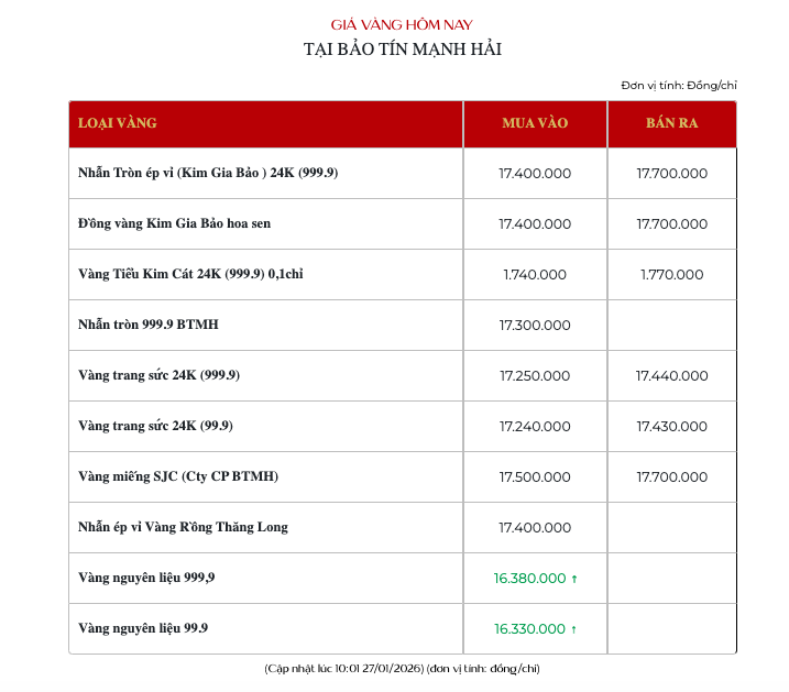 Vàng Kim Gia Bảo của Bảo tín Mạnh Hải niêm yết giao dịch tại 174 - 177 triệu đồng/lượng.