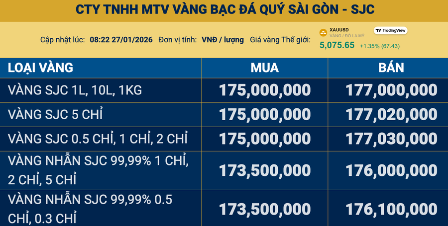 Giá vàng ngày 27/1: Vàng thế giới vượt 5.100 USD/ounce, vàng miếng SJC tăng cao 177 triệu đồng/lượng