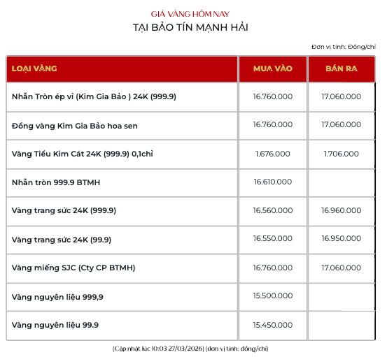 Vàng Kim Gia bảo của Bảo tín Mạnh Hải niêm yết tại 167,6 - 170,6 triệu đồng/lượng.