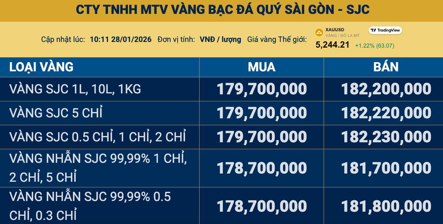 Giá vàng ngày 28/1: Vàng thế giới tiếp tục tăng, vàng miếng SJC lập kỷ lục chưa từng có, vượt 182 triệu đồng/lượng