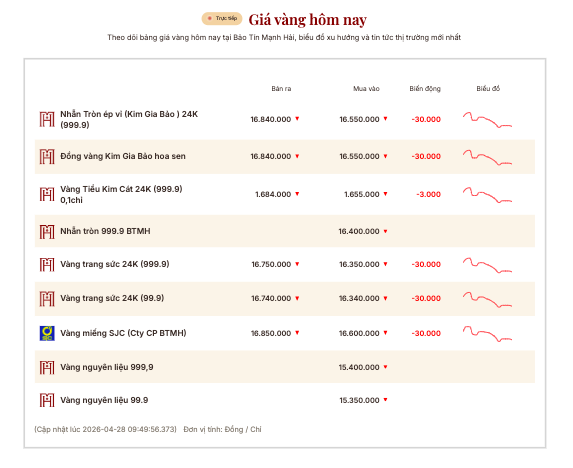 Giá vàng nhẫn Kim Gia Bảo tại Bảo tín Mạnh Hải niêm yết tại 165,5 - 168,4 triệu đồng/lượng.
