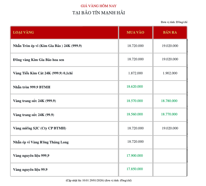 Vàng Kim Gia Bảo của Bảo tín Mạnh Hải niêm yết giao dịch tại 187,2 - 190,2 triệu đồng/lượng.