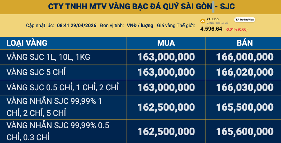Giá vàng SJC tại Công ty Vàng bạc đá quý Sài Gòn (SJC), Tập đoàn Doji, Phú Quý và hệ thống PNJ đồng loạt giảm thêm 1,5 triệu đồng/lượng ở cả hai chiều mua - bán so với chốt phiên trước, đưa giá giao dịch về mức 163 - 166 triệu đồng/lượng.