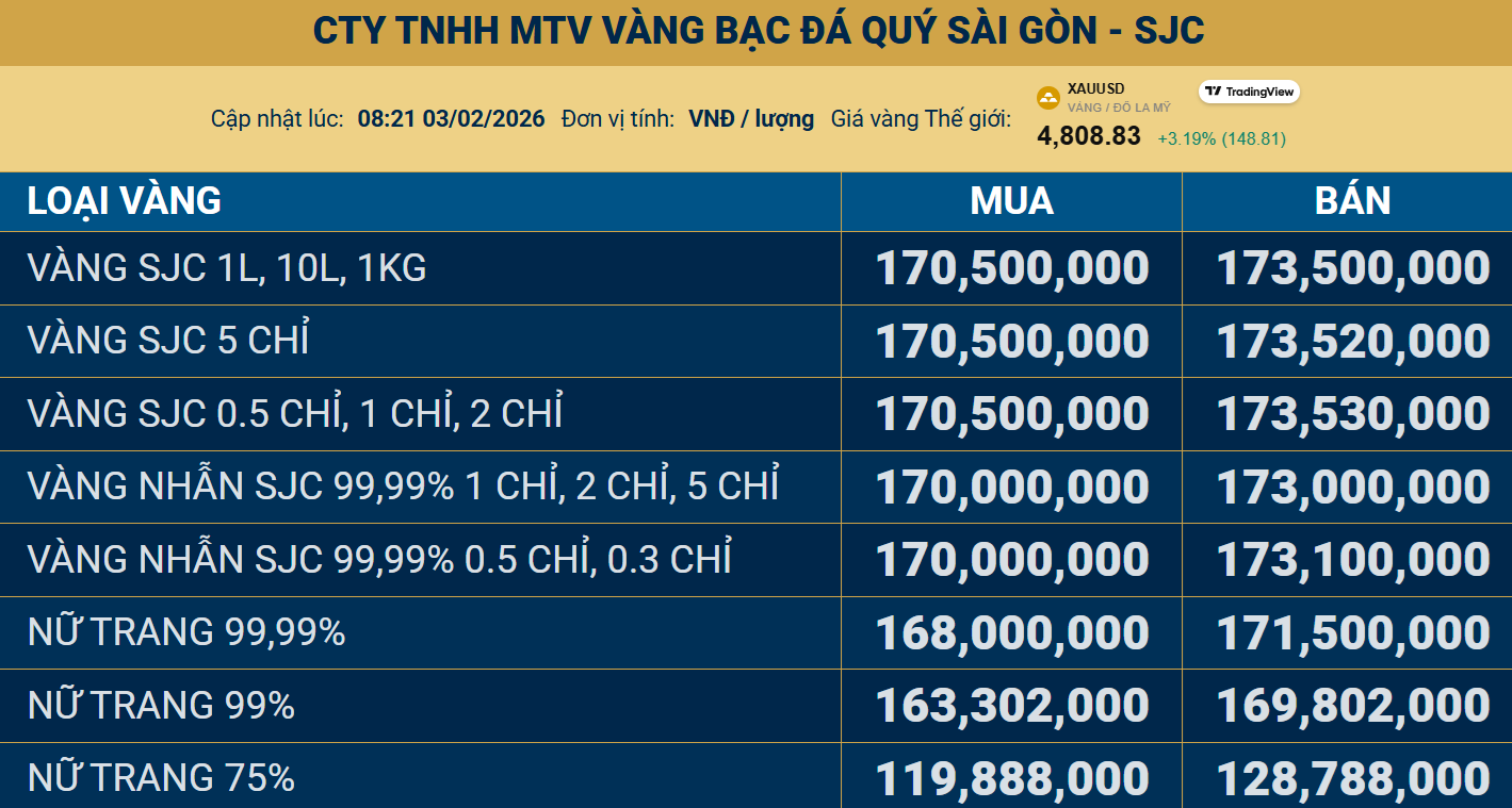 Tại Công ty Vàng bạc Đá quý Sài Gòn (SJC), giá vàng miếng SJC cùng điều chỉnh tăng 4,9 triệu đồng/lượng, giao dịch phổ biến quanh mức 170,5 - 173,5 triệu đồng/lượng.