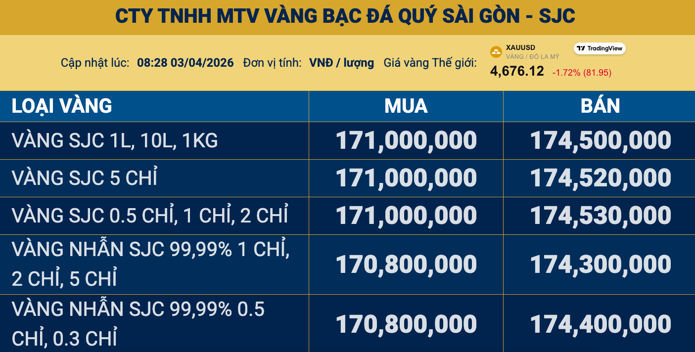 Tại các doanh nghiệp lớn như Công ty Vàng bạc đá quý Sài Gòn (SJC), giá vàng miếng SJC tăng 1 triệu đồng/lượng ở cả hai chiều mua vào và bán ra, hiện giao dịch phổ biến tại 171 - 174,5 triệu đồng/lượng.