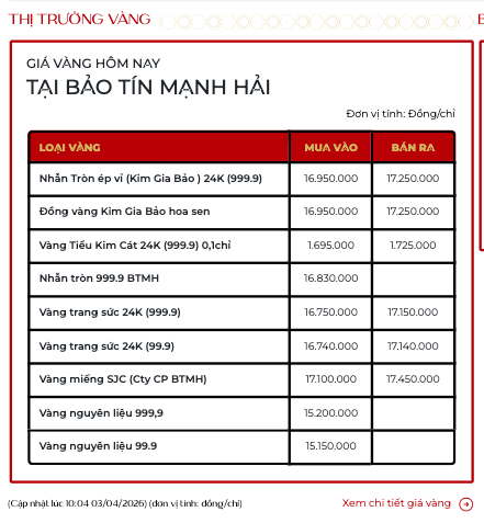 Vàng nhẫn Kim Gia Bảo tại Bảo tín Mạnh Hải giao dịch tại 169,5 - 172,5 triệu đồng/lượng.