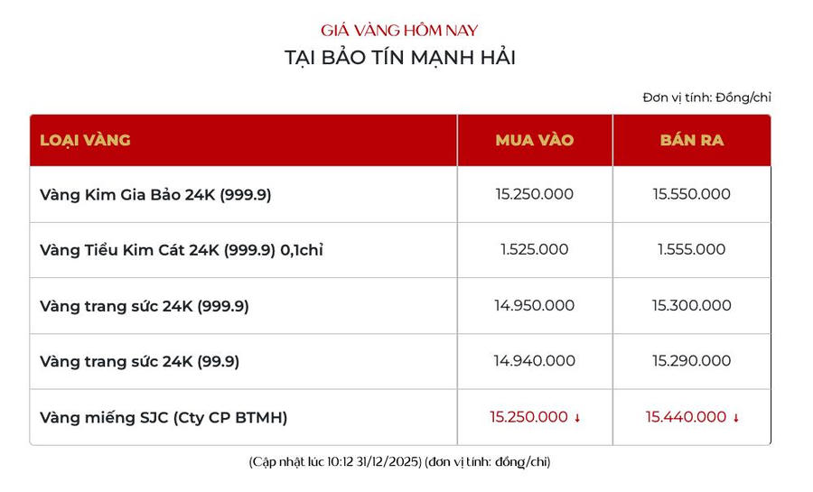 Cùng lúc đó, giá vàng trang sức 24K tại Bảo tín Mạnh Hải giảm nhẹ, niêm yết giao dịch tại 152,5 - 155,5 triệu đồng/lượng.