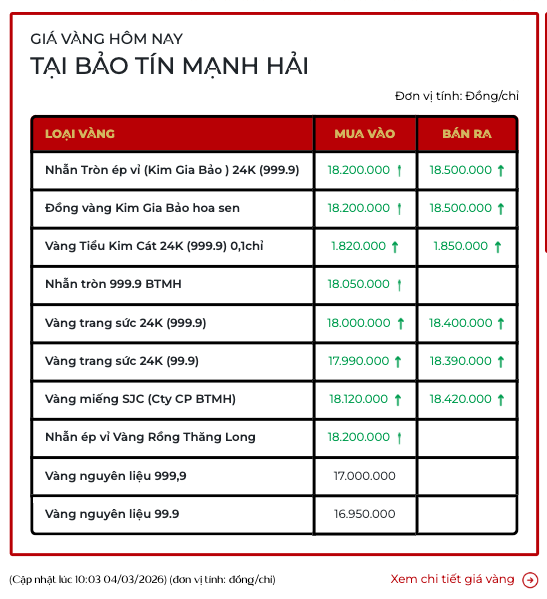Cùng lúc đó, nhẫn tròn ép vỉ Kim Gia bảo của Bảo tín Mạnh Hải niêm yết giao dịch tại 182 - 185 triệu đồng/lượng.
