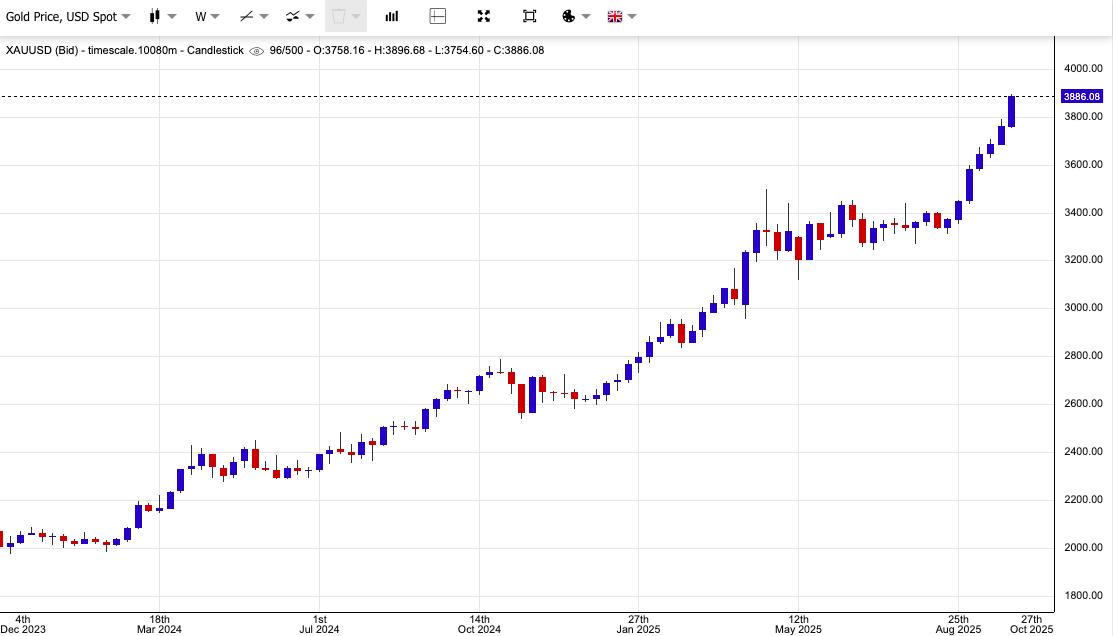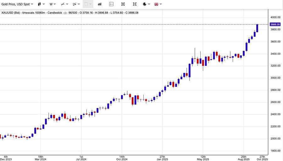 Giá vàng giao ngay tăng 0,77% lên 3.885 USD/ounce, sau khi lập kỷ lục mới 3.896,49 USD/ounce vào hôm qua. Tính chung cả tuần, giá vàng đã tăng hơn 3%. Giá vàng giao tháng 12 cũng tăng 1,05% lên 3.908,9 USD/ounce.