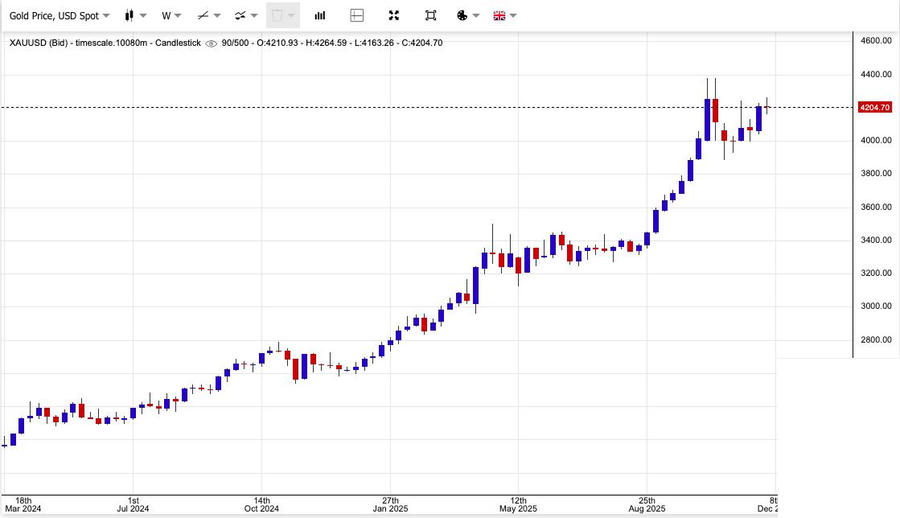 Chốt phiên giao dịch, giá vàng giao ngay tăng nhẹ 0,1% lên 4.210,49 USD/ounce và giá vàng giao tháng 2 tại Mỹ tăng 0,2% lên 4.243 USD/ounce.