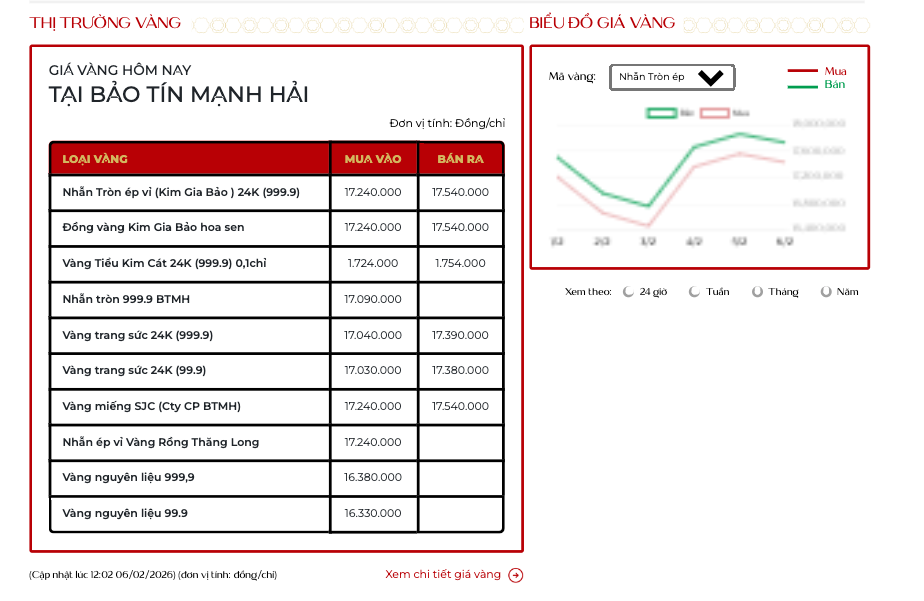 Cùng lúc đó, giá vàng miếng SJC tại Bảo tín Mạnh Hải niêm yết giao dịch tại 172,4 - 175,4 triệu đồng/lượng.