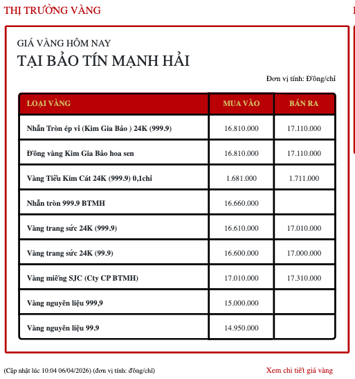 Giá vàng miếng SJC tại Bảo tín Mạnh Hải niêm yết tại 170,1 - 173,1 triệu đồng/lượng.