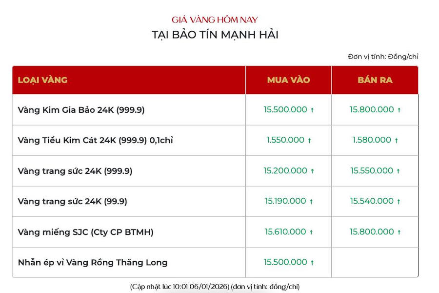 Cùng chiều diễn biến, giá vàng nữ trang tiếp tục duy trì đà tăng tích cực, niêm yết tại 151 - 154 triệu đồng/lượng. Vàng Kim Gia Bảo của Bảo tín Mạnh Hải niêm yết tại 155 - 158 triệu đồng/lượng.