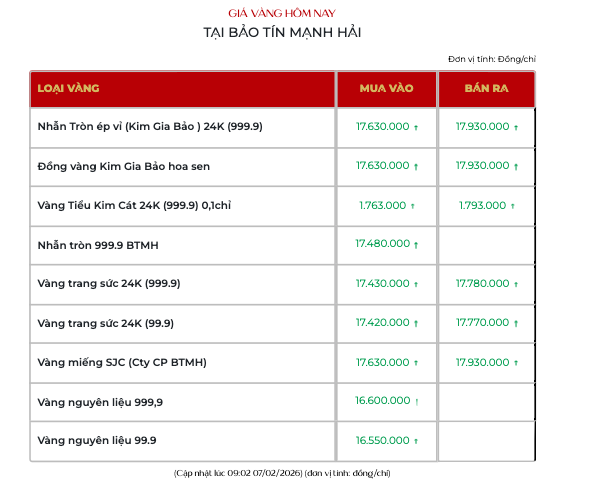 Cùng lúc đó, giá vàng miếng SJC tại Bảo tín Mạnh Hải niêm yết giao dịch tại 176,3 - 179,3 triệu đồng/lượng.
