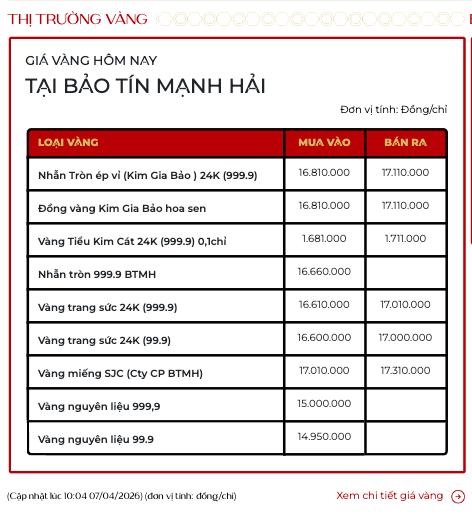 Vàng nhẫn Kim Gia Bảo tại Bảo tín Mạnh Hải niêm yết tại 168,1 - 171,1 triệu đồng/lượng.
