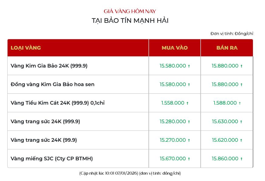 Cùng chiều diễn biến, giá vàng nữ trang tiếp tục duy trì đà tăng tích cực, niêm yết tại 151,6 - 154,6 triệu đồng/lượng. Vàng Kim Gia Bảo của Bảo tín Mạnh Hải niêm yết tại 155,8 - 158,8 triệu đồng/lượng.