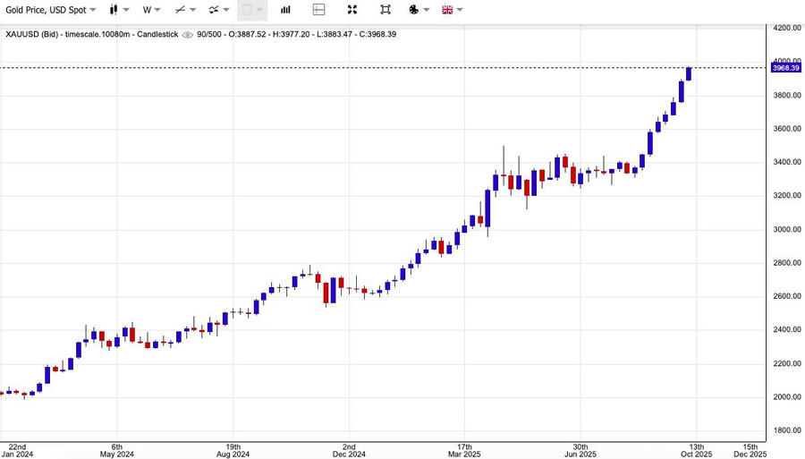 Tính từ đầu năm đến nay, giá vàng đã tăng 50%, một đợt tăng kỷ lục nhờ kỳ vọng Fed giảm lãi suất, hoạt động mua vào của các ngân hàng trung ương, nhu cầu trú ẩn an toàn bền vững và sự suy yếu của đồng USD. Giá vàng giao ngay lần đầu tiên vượt mốc 3.000 USD/ounce vào tháng 3 và tiếp tục phá ngưỡng 3.800 USD vào cuối tháng 9.