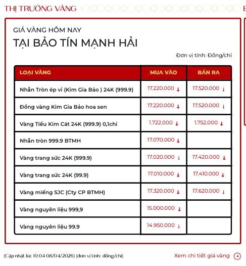 Trong phiên giao dịch sáng ngày 8/4, thị trường tiếp đà tăng mạnh. Giá vàng giao ngay tăng 2,34% lên 4.815 USD/ounce, theo kitco, và giá vàng giao tháng 6 tăng 2,53% lên 4.854 USD.