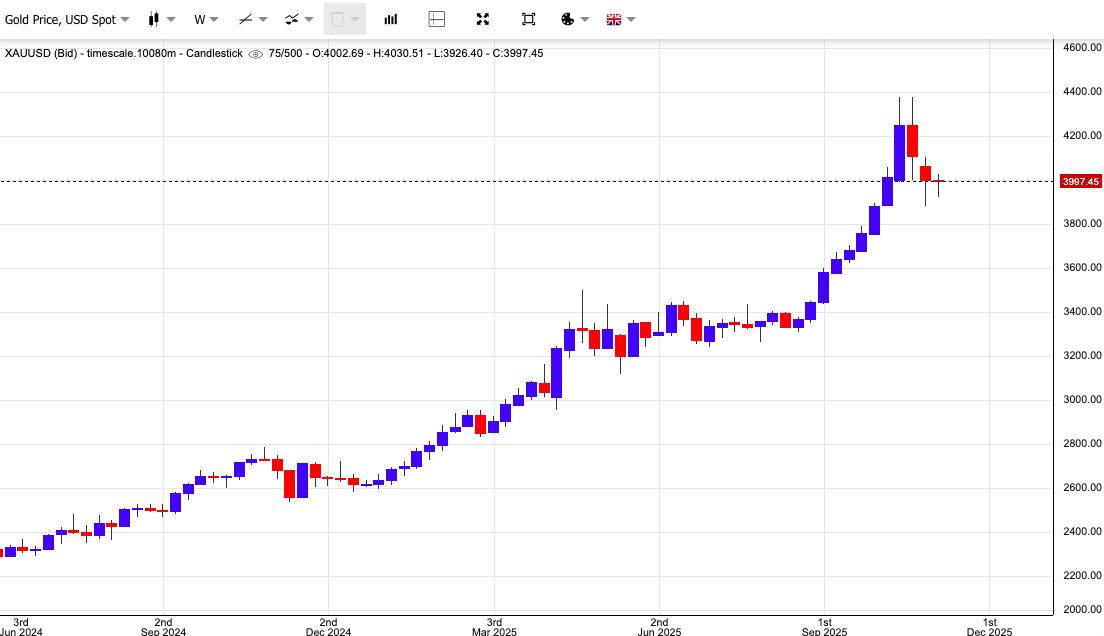 Chốt phiên giao dịch cuối tuần, giá vàng giao ngay tăng 0,6% lên 3.999,6 USD/ounce và giá vàng giao tháng 12 tăng 0,44% lên 4.008,45 USD/ounce.