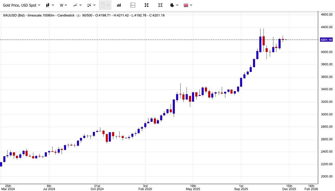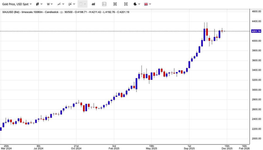 Bước vào cuối tuần trước, giá dường như đang mắc kẹt quanh mốc 4.200 USD/ounce. Dù vàng vẫn thể hiện sức mạnh bền bỉ, một số chuyên gia nhận định cần có thêm các yếu tố kích thích mới để đưa giá quay trở lại mức đỉnh kỷ lục hồi tháng 10. Với thời gian còn lại trong năm 2025 không còn nhiều, đây sẽ là một thách thức không nhỏ.