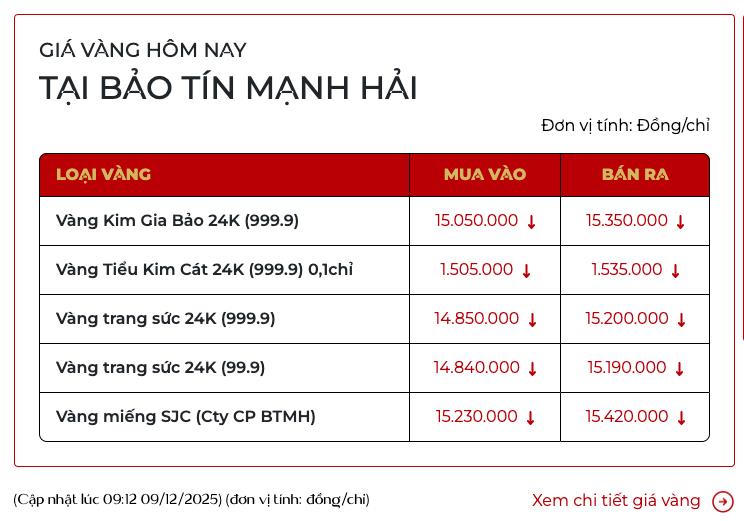 Cùng lúc đó, giá vàng trang sức 24K tại Bảo tín Mạnh Hải niêm yết giao dịch tại 148,5 - 152 triệu đồng/lượng.