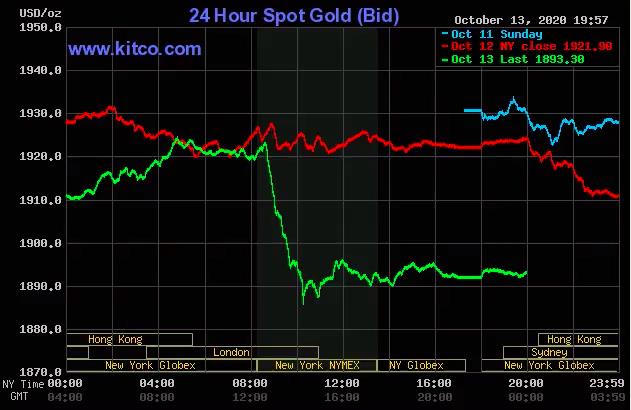 Chốt phiên giao dịch 13/10, giá vàng thế giới giao ngay đứng tại 1.891 USD một ounce. Sáng nay, giá vẫn dao động quanh mốc này.