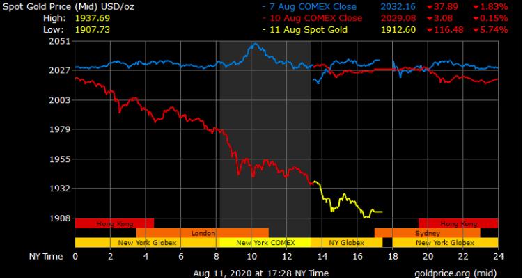 Đóng cửa phiên giao dịch nước Mỹ lúc 4h sáng ngày 12/8 (theo giờ Việt Nam), giá vàng giao ngay lùi về mốc 1.912 USD/ounce, mất tới 116 USD chỉ trong vòng 24h qua. Đây là mức giảm giá lớn nhất trong ngày của vàng trong vòng 7 năm qua.