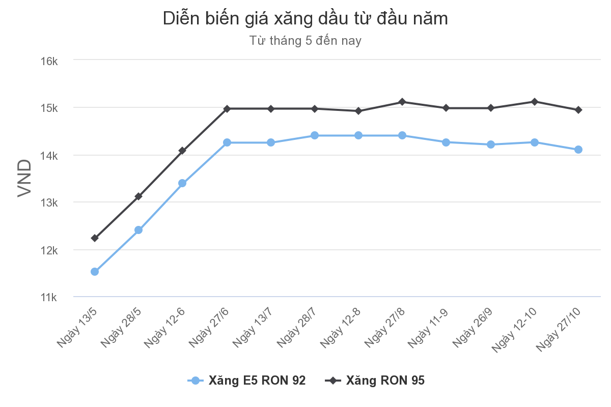 Liên Bộ Công Thương - Tài chính cho biết, với việc điều chỉnh này, giá xăng E5RON92 lên tối đa 14.109 đồng còn xăng RON95 giá cao nhất là 14.940 đồng. Dầu hoả tăng 123 đồng mỗi lít lên 9.717 đồng; dầu diesel tối đa 11.218 đồng một lít (tăng 90 đồng) còn dầu madut tối đa 11.261 đồng một kg, tương đương mức tăng 340 đồng.