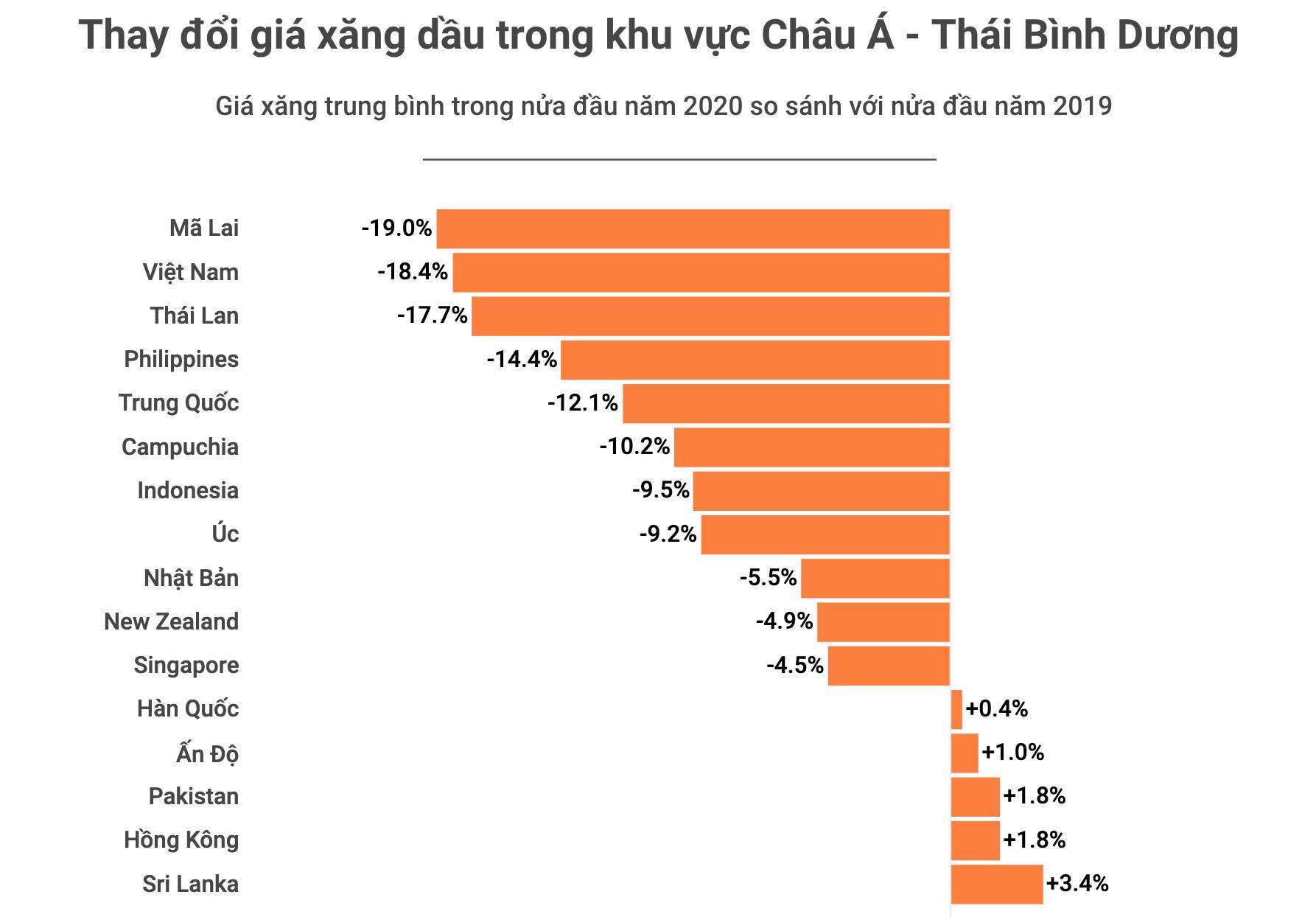 Với khu vực châu Á - Thái Bình Dương, 11 quốc gia được điều tra ghi nhận giảm từ 4,5% đến 19%, trong đó, Malaysia có mức giảm cao nhất. Việt Nam xếp thứ hai, giảm 18,4%, sau đó là Thái Lan 17,7%. Trái ngược xu thế giảm chung, giá xăng dầu tại các quốc gia, vùng lãnh thổ như Hàn Quốc, Ấn Độ, Pakistan, Hong Kong hay Sri Lanka lại có mức tăng mặc dù lượng không quá lớn.