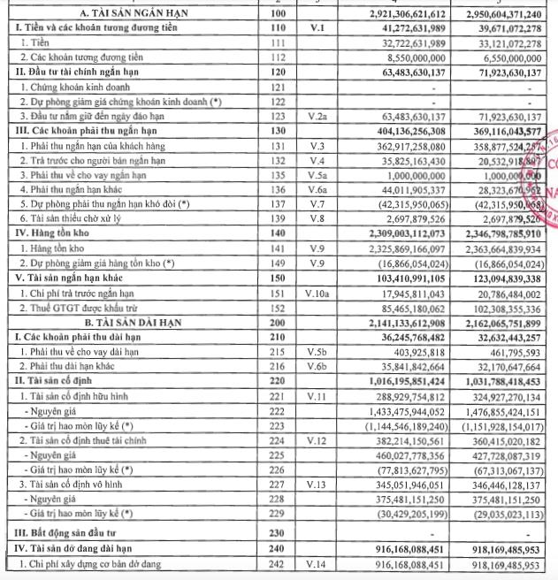 Các khoản phải thu ngắn hạn tăng 57%, lên 44 tỷ đồng. Ngoài ra, hàng tồn kho giảm nhẹ về 2.325 tỷ đồng, chiếm phần nhiều là chi phí sản xuất, kinh doanh dở dang và nguyên vật liệu.