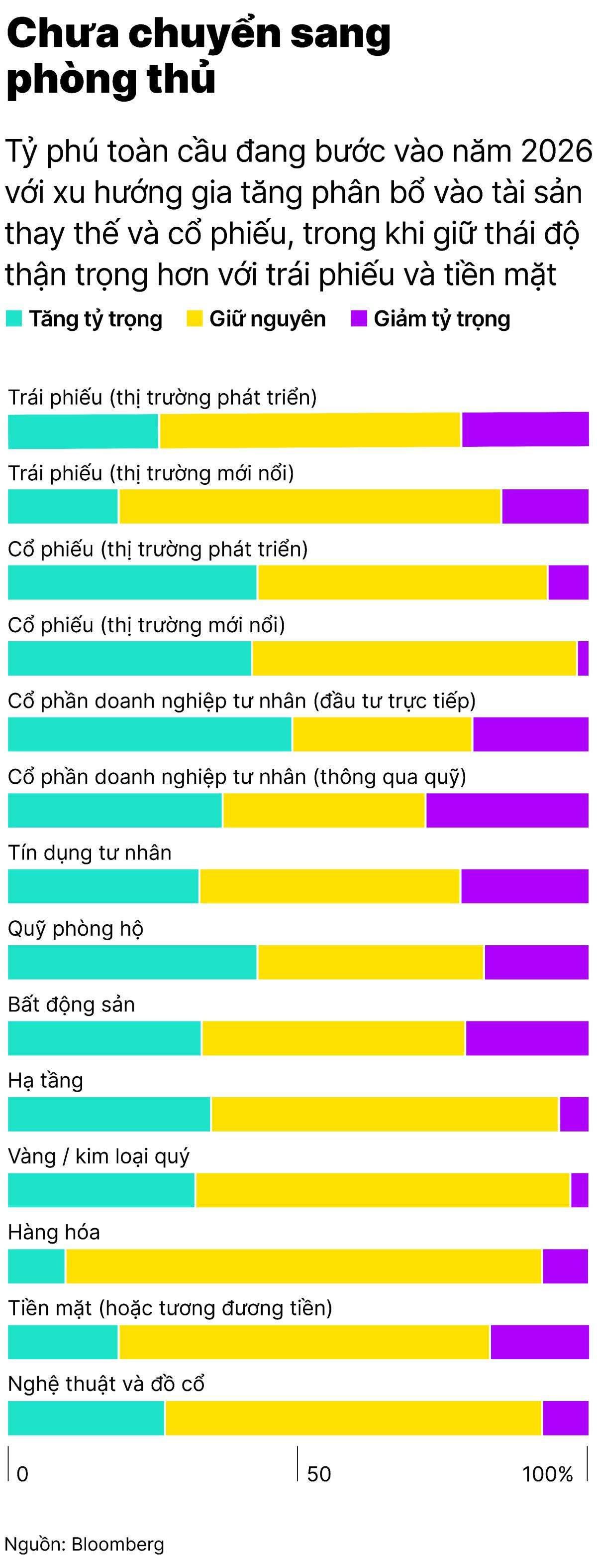 Khảo sát trực tuyến do UBS thực hiện đối với 87 khách hàng tỷ phú trên toàn cầu vào cuối năm 2025 cho thấy sự quan tâm đặc biệt đối với cổ phần doanh nghiệp và tài sản thay thế. Trong khoảng thời gian 12 tháng tới, 49% số tỷ phú tham gia khảo sát xác nhận tăng tỷ trọng rót vốn vào cổ phần doanh nghiệp tư nhân thông qua hình thức đầu tư trực tiếp. Tỷ lệ này đạt 37% đối với hình thức đầu tư qua các quỹ tài chính chuyên biệt.