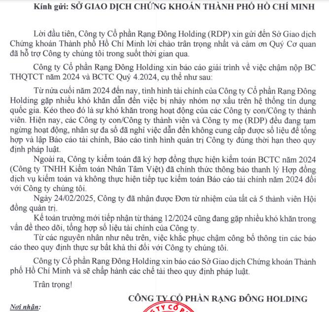 Giải trình với HoSE, Rạng Đông Holding (RDP) cho biết ngừng hoạt động, nhiều nhân sự đã nghỉ việc