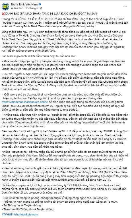 Theo bà Lê Hạnh, từ năm 2022 đến nay, Chương trình và các Shark đã nhiều lần thông tin cảnh báo trên các Fanpage chính thức có tick xanh của chương trình, các Shark, đồng thời đăng tải đưa tin cảnh báo về việc các tài khoản mạng xã hội mạo danh các Shark để lừa đảo chiếm đoạt tài sản.