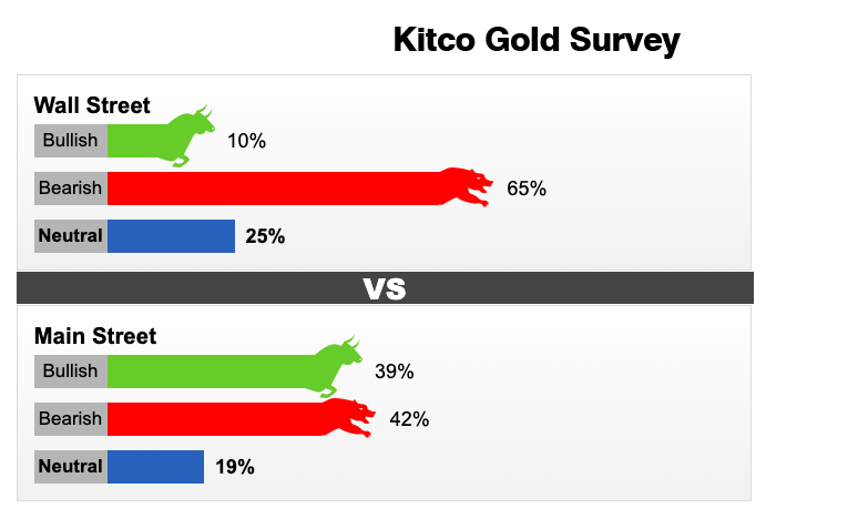 Tương tự, tại cuộc khảo sát trực tuyến ở phố Main, có 596 nhà đầu tư tham gia trả lời trong đó 39% nhận định giá vàng tăng, 42% cho rằng giá vàng giảm và số còn lại dự đoán giá vàng đi ngang.