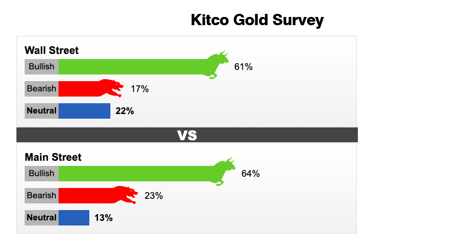 Cuộc khảo sát về vàng hàng tuần đầu tiên của Kitco News cho thấy tâm lý của các nhà phân tích Phố Wall và các nhà đầu tư Phố Main đang tăng giá mạnh mẽ.