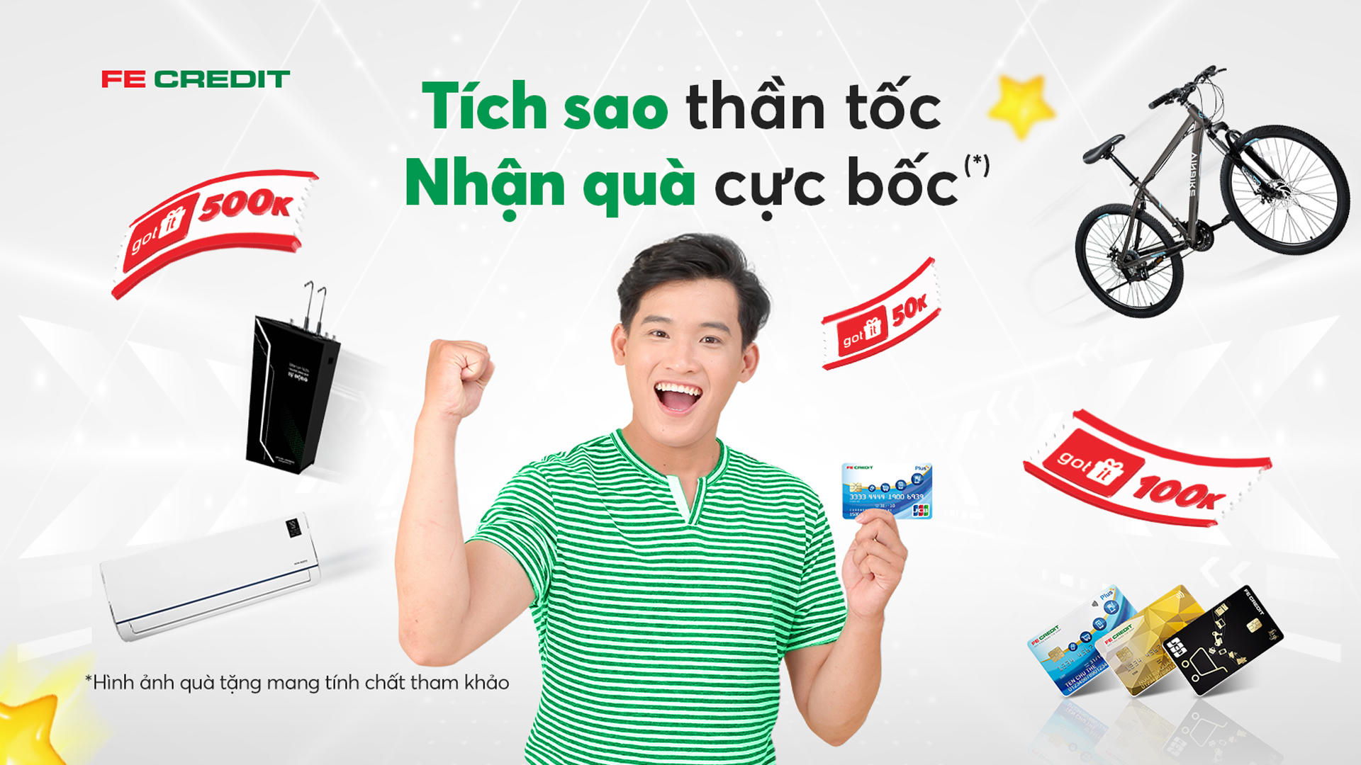 Đồng thời, từ nay đến hết 30/6/2023, với mỗi giao dịch thanh toán, chi tiêu, mua sắm thành công trên thẻ tín dụng FE CREDIT, chủ thẻ sẽ nhận được số Sao tương ứng với tổng số tiền đã chi tiêu (10.000 đồng sẽ quy đổi được 1 Sao). Số Sao tích lũy để quy đổi thành nhiều phần quà hấp dẫn như Máy lạnh, máy lọc nước, xe đạp, voucher mua sắm Got It…