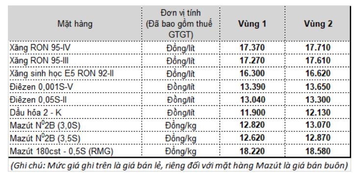 Theo đó, mỗi lít xăng RON 92 vẫn được bán ở mức 16.309 đồng, xăng RON 95 là 17.270 đồng. Giá bán của dầu diesel là 13.042 đồng; dầu hỏa là 11.908 đồng và dầu mazut là 12.622 đồng/kg.