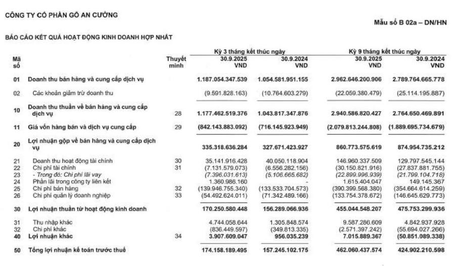 Lũy kế 9 tháng đầu năm 2025, hãng gỗ An Cường đạt doanh thu thuần 2.940 tỷ đồng và lãi sau thuế 358,3 tỷ đồng, lần lượt tăng 6% và 9% so với cùng kỳ năm trước.