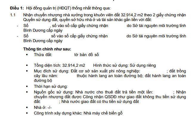 CTCP Gỗ Đức Thành (mã ck: GDT) vừa công bố nghị quyết HĐQT về việc nhận chuyển nhượng quyền sử dụng đất, quyền sở hữu nhà ở và tài sản gắn liền với đất nhà máy 7 tại tọa lạc tại phường Chánh Phú Hòa, TPHCM (trước đây thuộc TP Bến Cát, tỉnh Bình Dương cũ).