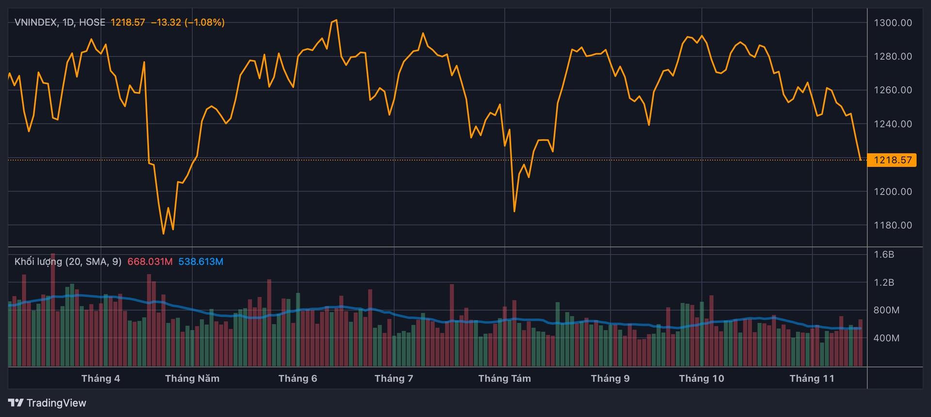Thị trường chứng khoán khép lại tuần giao dịch 11-15/11 ảm đạm khi ghi nhận mức sụt giảm tới gần 34 điểm (tương đương mất 2,7%) xuống vùng 1.218, mức thấp nhất trong vòng hơn 3 tháng qua. Áp lực bán dâng mạnh trong hai phiên cuối tuần (-27,5 điểm) khiến tâm lý thị trường trở nên bi quan.