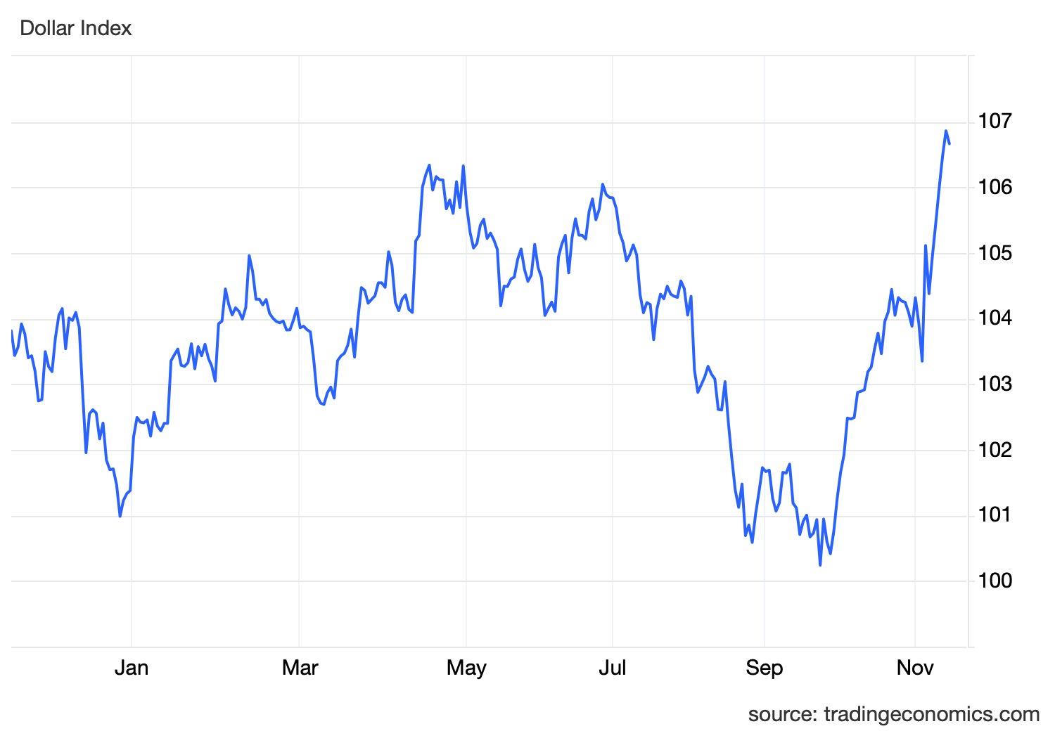 Ông Đinh Quang Hinh - Trưởng Bộ phận vĩ mô và chiến lược thị trường, Khối Phân tích VNDIRECT nhận định thị trường tiếp tục trải qua một tuần điều chỉnh khi áp lực tỷ giá và lãi suất liên ngân hàng chưa có dấu hiệu hạ nhiệt. Cụ thể, chỉ số dollar index (DXY) tiếp tục duy trì đà tăng trong tuần qua do kỳ vọng về việc Fed hạ lãi suất trong cuộc họp tháng 12 tới giảm xuống sau thông tin về chỉ số CPI của Mỹ trong tháng 10 phù hợp với dự báo của thị trường nhưng cao hơn so với tháng 9 và bình luận của Chủ tịch Fed Powell mới đây về việc Fed không cần vội vàng trong việc hạ lãi suất.