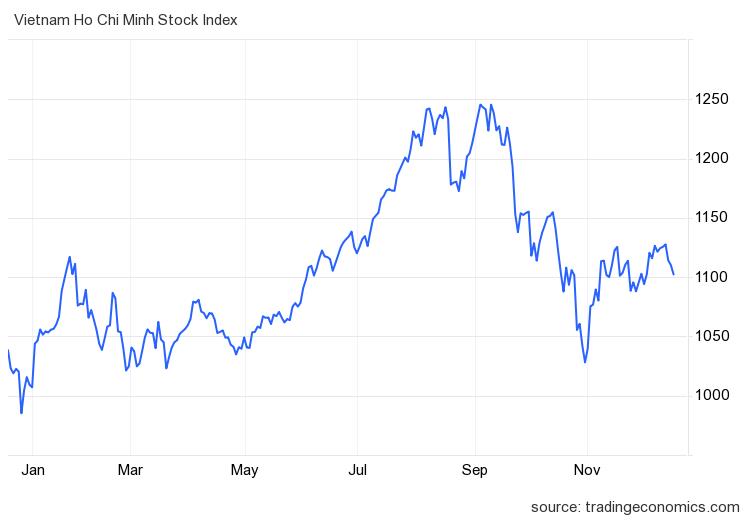 Thị trường chứng khoán Việt Nam ghi nhận tuần giao dịch 11-15/12 khá ảm đạm. Áp lực bán chủ động gia tăng mạnh trong 3 phiên cuối tuần khiến chỉ số VN-Index liên tục mất điểm, một lần nữa "tìm đường" về ngưỡng tâm lý 1.100 điểm. Kết tuần, VN-Index đóng cửa tại 1.102,3 điểm, giảm hơn 22 điểm (tương đương -1,97%) so với tuần trước. Thanh khoản trên HoSE tiếp tục ở ngưỡng thấp cho thấy tâm lý thận trọng của nhà đầu tư trước bối cảnh xu hướng của chỉ số chính chưa thật sự được xác lập.